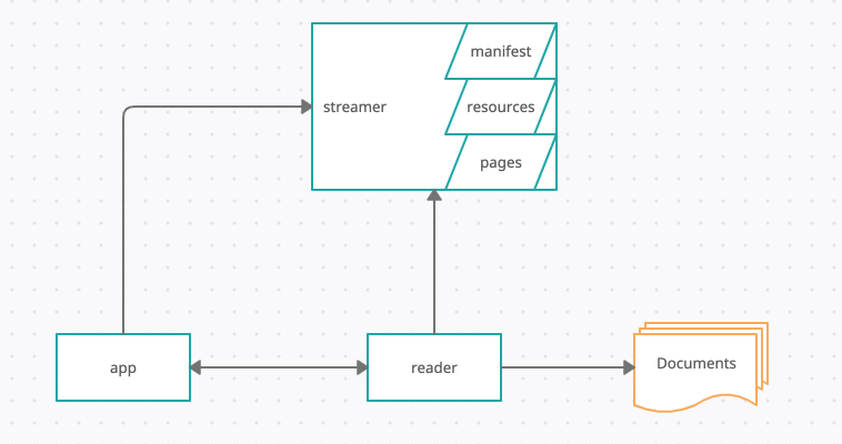 The engine that renders the book on your web page. It consume a manifest which represent an electronic publication structure (reading direction, list of items, their path in the book, etc). By default the reader will use the URL provided for each item to fetch and display each page, which brings us to the streamer.
